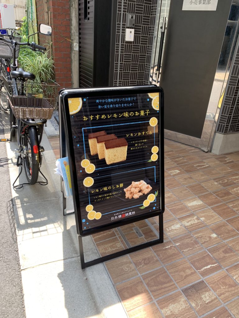 去的時候正好是檸檬祭,門前立著限定「檸檬長崎蛋糕」與「檸檬鹽麻糬」的招牌。
