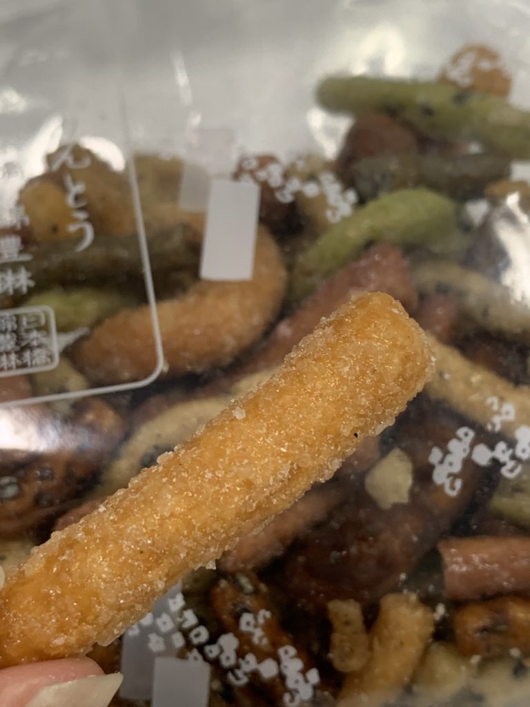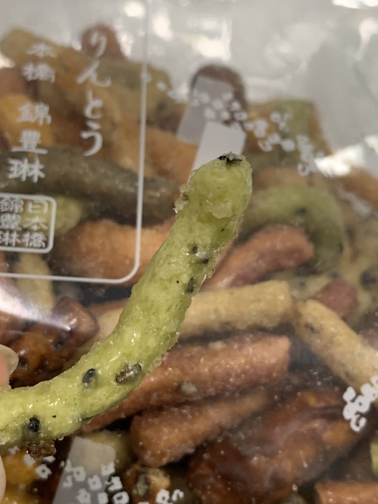 這種花林糖是細長型的。錦豐琳的特色之一是在普遍都是甜的口味之外,加入了多種蔬菜⋯⋯等風味的調味料,製作出鹹的花林糖。像我手上這根,吃起來像是牛蒡的口味。