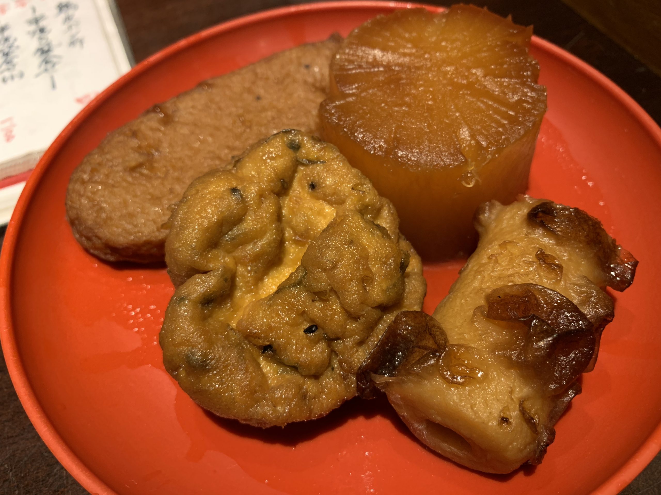 再度選擇困難發作,猶豫要點什麼⋯⋯最後點了單人組合。裡面有蘿蔔、竹輪、雁擬豆腐與魚漿類製品。顏色看起來偏深,不過味道適中、細緻且美味。