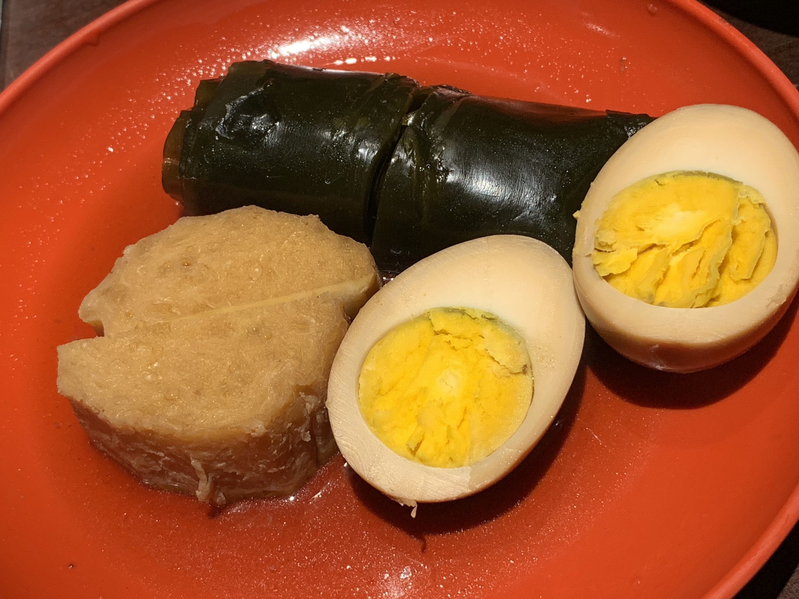 因為太好吃了所以又加點了昆布卷、魚筋(?)與雞蛋;雖然不太確定魚筋是什麼⋯⋯(聽說也是魚漿製品)。