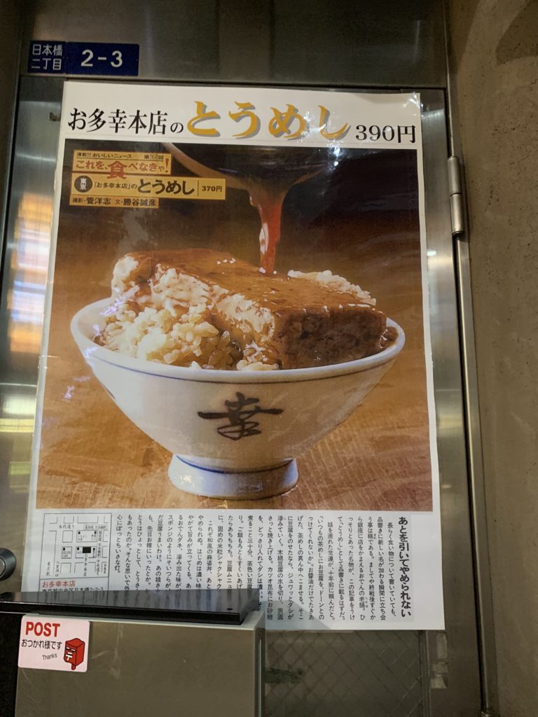 從東京站步行約5分鐘、日本橋步行約1分鐘即可抵達,以關東煮和招牌とうめし|toumeshi 聞名的お多幸。本店於1923年創業於銀座,並於2002年遷移至現今位於日本橋的位置繼續營運。