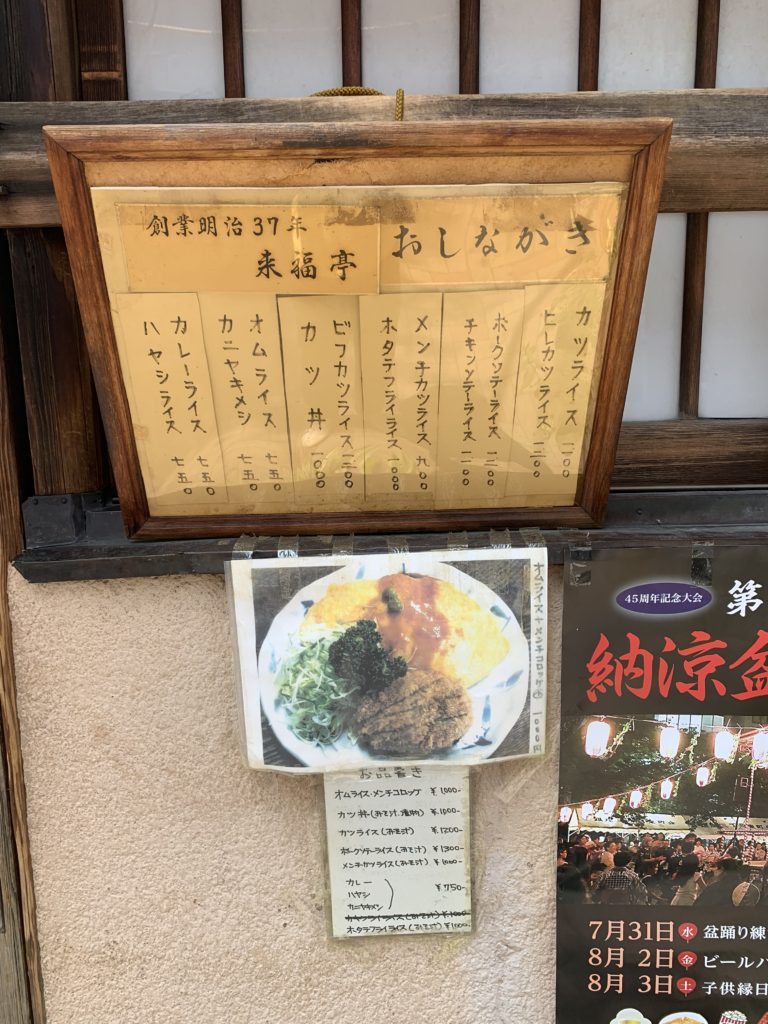 來福亭位於從人形町站步行約1分鐘左右的地方;它夾在1760年創業的親子丼發祥店玉ひで|Tamahide 與之前介紹過 – 1919年創業的喫茶店快生軒之間,是一家創業於1904年的老店。