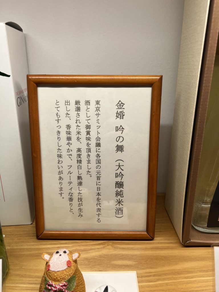 代表銘柄(即招牌商品)「金婚 吟之舞」曾於東京高峰會上用來招待各國貴賓,並被明治神宮、神田明社等神社指定為供奉給神明的神酒~